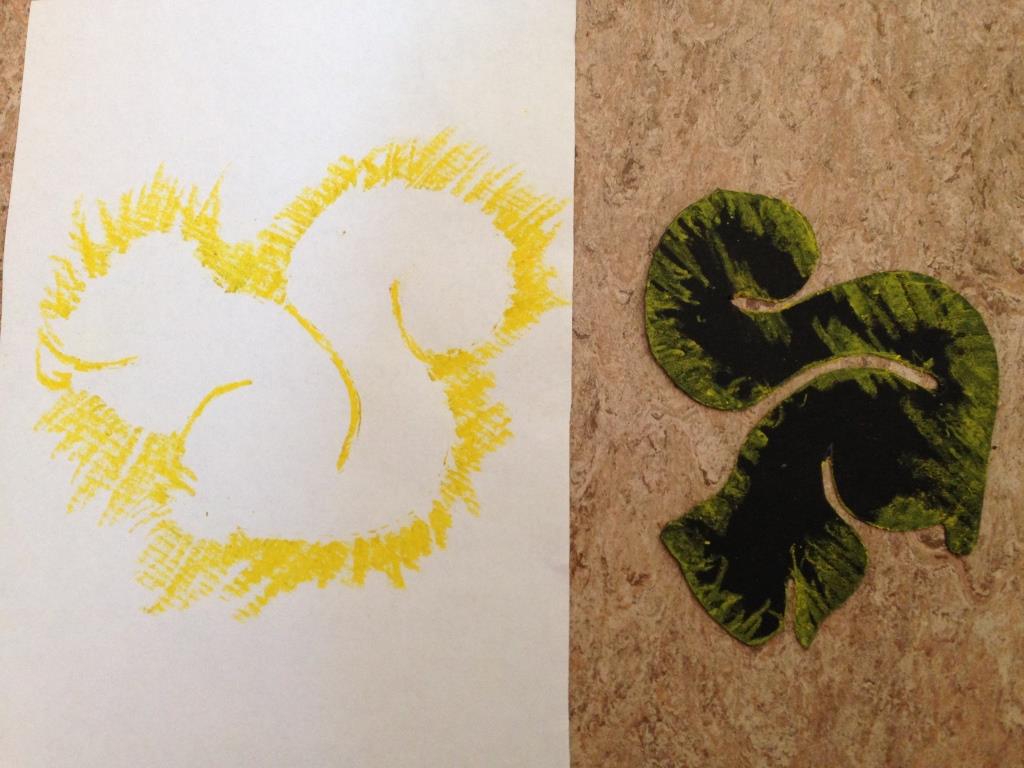 Mókus sablont egy lapra helyezünk és zsírkrétával átszínezzük, így a mókus árnyékát fogjuk látni.