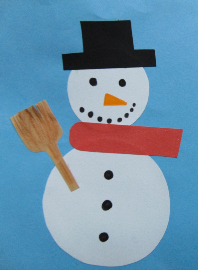 Hóembert készítünk ragasztásos technikával (fej, test, sál, kalap, seprű kerül a kivágott hóember formánkra).