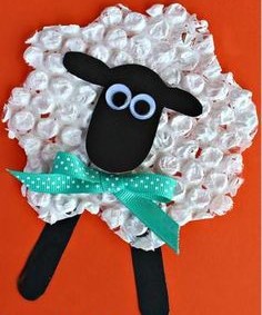 Bárányt készítünk. Festeni és ragasztani is fogunk az alkotás során. A nap elején végezzük el a festéseket, hogy legyen elég idÅ‘ a száradáshoz. Buborék fóliával dolgozunk. Az elÅ‘re kivágott fóliát karton alapra ragasztjuk, majd fehér temperával, szivacsot használva, fehérre festjük. Hagyjuk megszáradni, majd a fóliára ragasztjuk, az elÅ‘re kivágott fejecskét, szemeket és lábakat. A bárányunk nyakából a masni sem maradhat el.