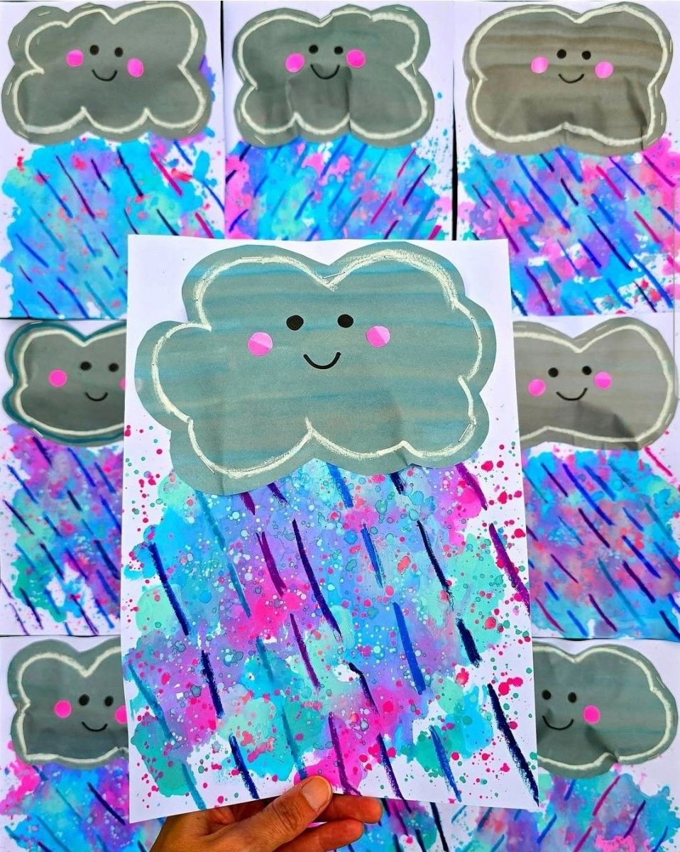 EsÅ‘felhÅ‘t készítünk. ElÅ‘ször az alapunkat festjük ki jó színesre. Szivacsot használunk hozzá és temperát. (Ezt még a nap elején érdemes megcsinálnunk, hogy biztosan megszáradjanak a remekművek.) A kiszínesedett alapokra ragasztjuk majd fel az elÅ‘re kivágott felhÅ‘formákat, végül fültisztító pálcikát használva esÅ‘cseppeket festünk a felhÅ‘k alá.