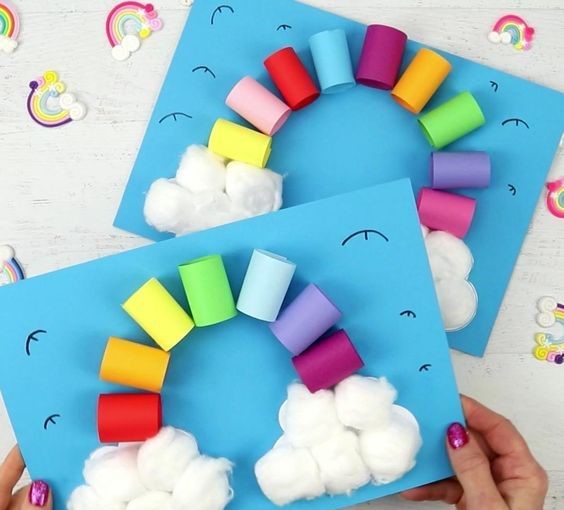 Szivárványt készítünk. ElÅ‘re kivágott papír elemekkel dolgozunk. A színes csíkjainkból gyűrűket tekerünk az ujjunk köré és összeragasztjuk azokat. Eztán két vatta kupacot ragasztunk a kék karton alapunk két szélére. Ezek lesznek a felhÅ‘k, melyeket a szivárvány köt össze egymással. A korábban elkészített gyűrűket ragasztjuk szépen egymás mellé sorba, így készül el a csodálatos színekben pompázó szivárványos alkotásunk.
