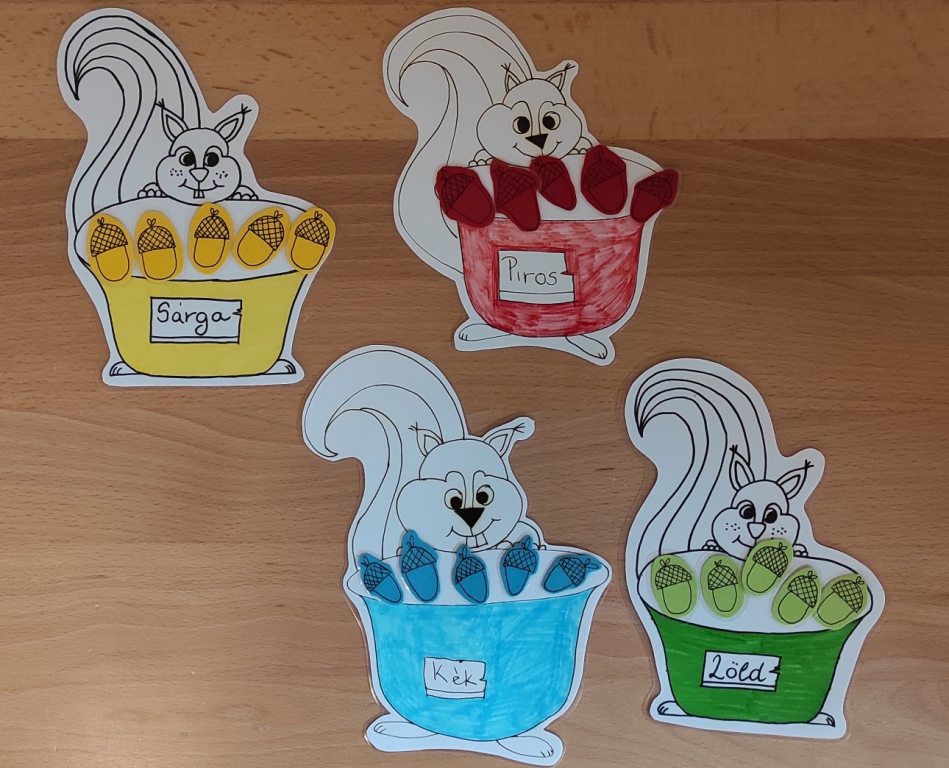 Csendjátékunk során mókusokat etethetnek makkal a gyerekek. Természetesen minden mókus csak a vele azonos színű makkot eheti meg.