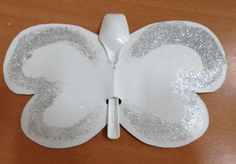 Műanyag kanálból pillangót készítünk: a kanál lesz a pillangó teste, kartonpapírból pedig a szárnyai, amit belefűzünk a kanálba. A pillangó szárnyát csillámporral díszítjük.