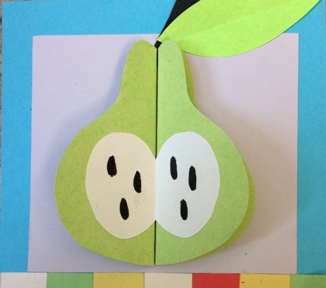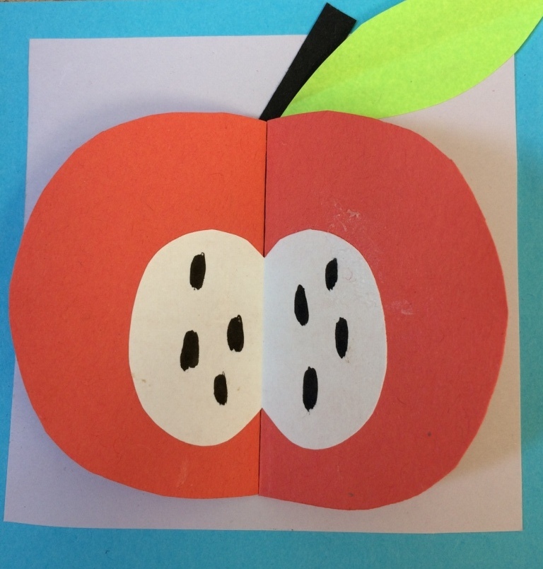 Megvizsgálunk egy-egy félbevágott almát és körtét, s mi is készítünk félbevágott, 3D-s almát és körtét a gyerekekkel hajtogatással és ragasztással.