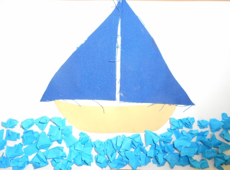 Vitorlás hajót készítünk ragasztással. A vitorláját anyagból, a hajótestet színes papírból, a vizet kék papírgalacsinokból ragasztjuk meg.