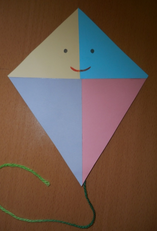 Előre elkészített papírsárkányra ragasztunk színes háromszögeket összeillesztéssel, és fonalból eregető zsinórt ragasztunk rá, majd szemet és szájat rajzolunk, elkészült papírsárkányunknak.