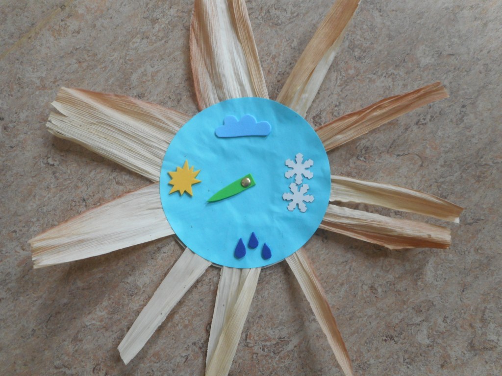 Időjárás óránkat kartonból, dekorgumiból és kukoricacsuhéból készítjük.
