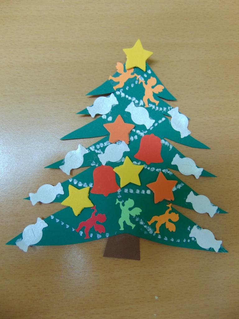 A karácsonyfa formára kivágott zöld kartonpapírt beragasztózzuk, majd feldíszítjük előre kivágott gömbökkel, csillagokkal, fényfüzérrel.