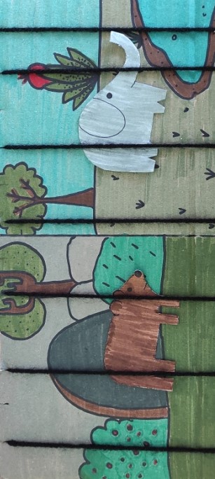 Állatkerti látképet készítünk. Az előre megrajzolt karton alapunkat színezéssel díszítjük, majd az előre kivágott mackó és elefánt mintát ragasztóval rögzítjük az alapra. Fonallal érzékeltetjük a rácsokat. Az előre beirdalt karton alapon vezetjük át vezetjük fonalunkat.
